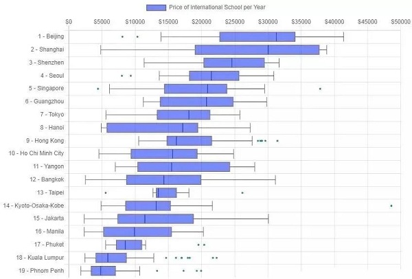 據(jù)International Schools Database發(fā)布的亞洲國(guó)際學(xué)校學(xué)費(fèi)排名,北京、上海、深圳占據(jù)了榜單前3名。新加坡第5,廣州第6,香港則排第9。