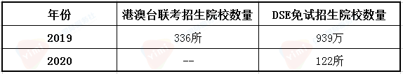 2019年錄取最低分數線400分的院校共136所(錄取線400以上意味985、211等重點大學);而2020年參加DSE的內地院校為122所。