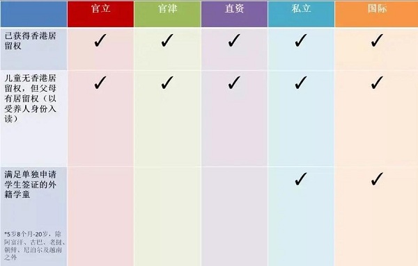 孩子目前的身份是以受養(yǎng)人,與親屬的香港居留身份掛鉤,因此無論是香港官津、直資、私立,還是國際學(xué)校,都可申請。