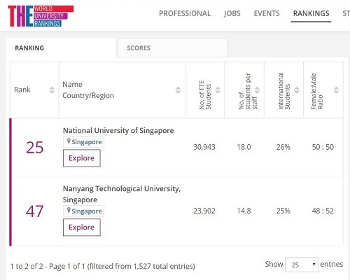 在此次2022年度榜單中,新加坡國立大學排名第21名,新加坡南洋理工大學排名第46名。與2021年度的泰晤士高等教育世界大學排行榜單排名相比,均有小幅度上升。
