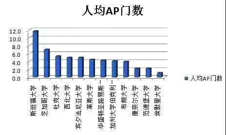 從數據統計圖中,我們可以發現,大部分美國本科前二十的學校,人均學習的AP數量在4門左右。其中最高的斯坦福這樣的頂級名校,人均AP門數達到了11.7門之多。