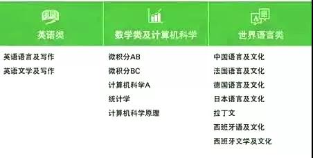 雖然科目眾多,但中國學生擅長數理化的學科,再加上文理搭配原則,一般考以下科目:微積分AB/BC,物理C力學/電磁學,化學,微觀經濟學,宏觀經濟學,物理1/2,美國史,心理學,計算機科學。