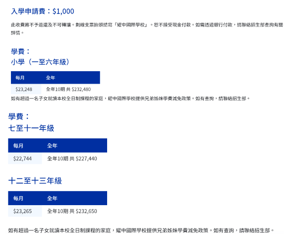 申請耀中國際學校入讀,除了學費,耀中是要收債券的。年級越大,債券的金額就越大。中學部第1名子女入讀,需要繳納47萬,加上23萬左右的學費,入讀中學一年級,就要交70萬。