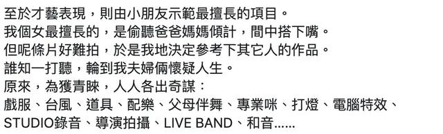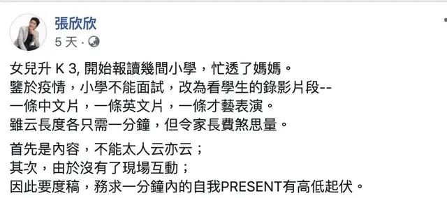 前不久,育有一子一女的中文補(bǔ)習(xí)名師張欣欣在facebook分享為女兒拍面試片經(jīng)歷: