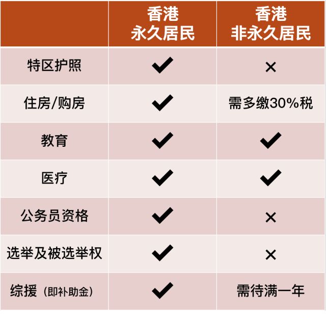 而非永久性居民需要出國,只能用中國護照,或申請俗稱“黃簿仔”的「香港特別行政區簽證身份書」作為旅游證件。以單身人士為例,單身的香港永久居民,只要入息及資產上限,不超過10,100元及236,000元,即可向房委會遞交申請表參與輪候。