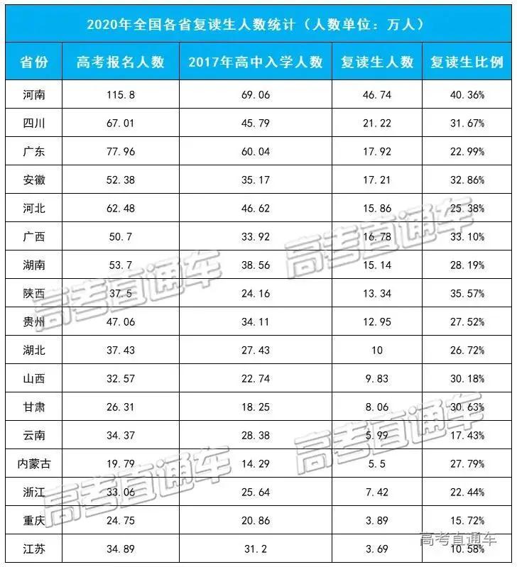 近日,各省份陸續公布了2020年高考復讀生的人數: