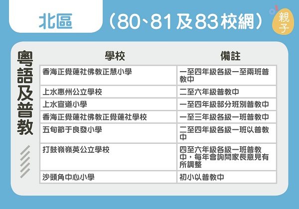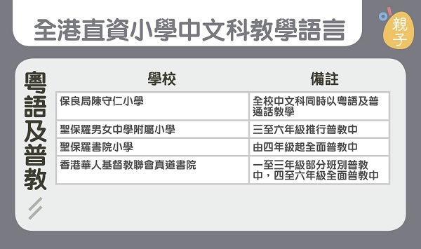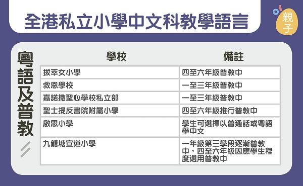 記者逐一向全港所有直資、私立、資助及官立小學查詢各校中文科教學語言,以下是以粵語及普通話同時教學的小學名單:
