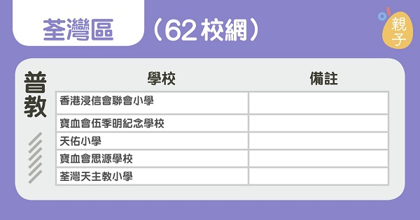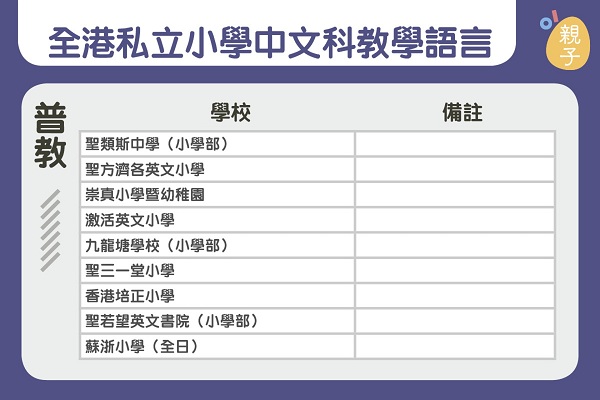記者逐一向全港所有直資、私立、資助及官立小學查詢各校中文科教學語言,以下是以普通話教學的小學名單:
