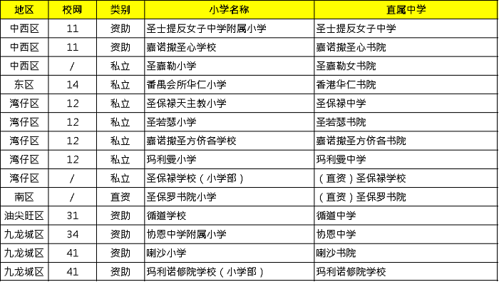 除了「一條龍」,還有資助和官立學校可以有某個百分率%可以直升。直屬學校如喇沙小學的六年級生,在扣除「自行分配.和「重讀生」,在剩余約(100-55=)45%學額,保留85%學額直升上其直屬中學,喇沙書院。聯系學校(多為官立或慈善團隊辦的學校)像直屬扣除自行分配學位后,剩余的45%學額,保留25%學額直升上其聯系中學,例如軒尼詩官立小學有某個百份比(視乎有多少所小學)直升上皇仁書院(男)或庇理羅士女子中學(女)等。