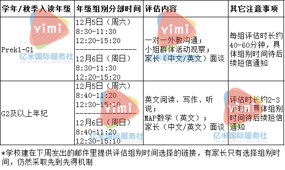 PreK1-G1考試的時間為:12月5日或12月6日的8:30-11:30/12:20-15:20,評估內(nèi)容為:一對一外教溝通;小組群體活動觀察;家長(中文或英文)面談,每組評估時間約為40-60分鐘。