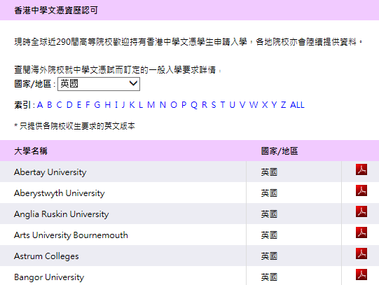 DSE在國際上具有很高的認受性,考評局資料顯示,現時全球超290所高等院校歡迎DSE學生申請入學,其中包括英國劍橋大學、美國耶魯大學、新加坡國立大學等名牌大學!