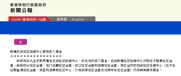 據香港特區政府新聞處消息,香港政府在九龍及新界增設5間社區核酸檢測中心,分別位于荔景社區會堂、粉嶺和興社區會堂、屯門兆麟社區會堂、坑口社區會堂和油塘社區會堂。連同早前已開始運作的四間社區檢測中心(東區鰂魚涌社區會堂、梁顯利油麻地社區中心、沙田瀝源社區會堂及元朗市東社區會堂),香港一共有九間社區檢測中心為市民提供相關檢測服務。