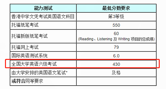 香港城市大學接受學生用六級成績申請,不同專業對六級分數要求不同。