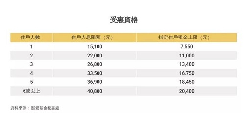 另外,申請人與同住成員均不可在港有物業,入息不可超過指定限額;若租住單位是來自家人、領取綜援人士也不符合資格。