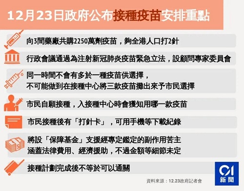 特首林鄭月娥本周公布,中國科興生物(Sinovac)的滅活技術生產疫苗最快一批100萬劑下月(1月)到港。此外,港府也訂購其它種類疫苗合共2250萬劑,足夠香港人口注射兩劑。