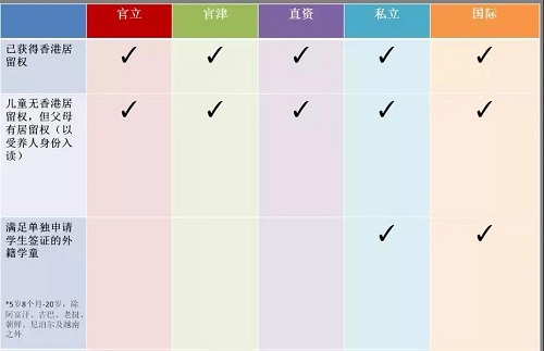 兒童沒有居留身份,但直系親屬有居留身份的,孩子可以以受養人的方式來香港讀書。無論是官津、直資、私立,還是國際學校,都可接受報名。