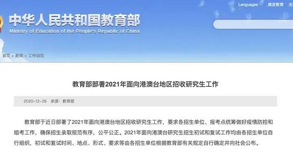 2021年面向港澳臺(tái)地區(qū)招收研究生工作,網(wǎng)上報(bào)名時(shí)間為2021年1月1日至15日。