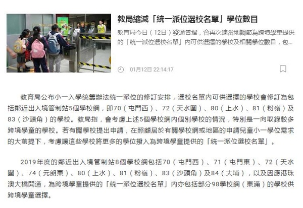 并且隨著跨境小一新生近年持續減少,教育局宣布修訂升小統一派位「跨境生專網」安排,包括大埔、東涌等四個校網,不再預留學額給跨境生;余下五個校網,則維持每校每班預留一個學額。