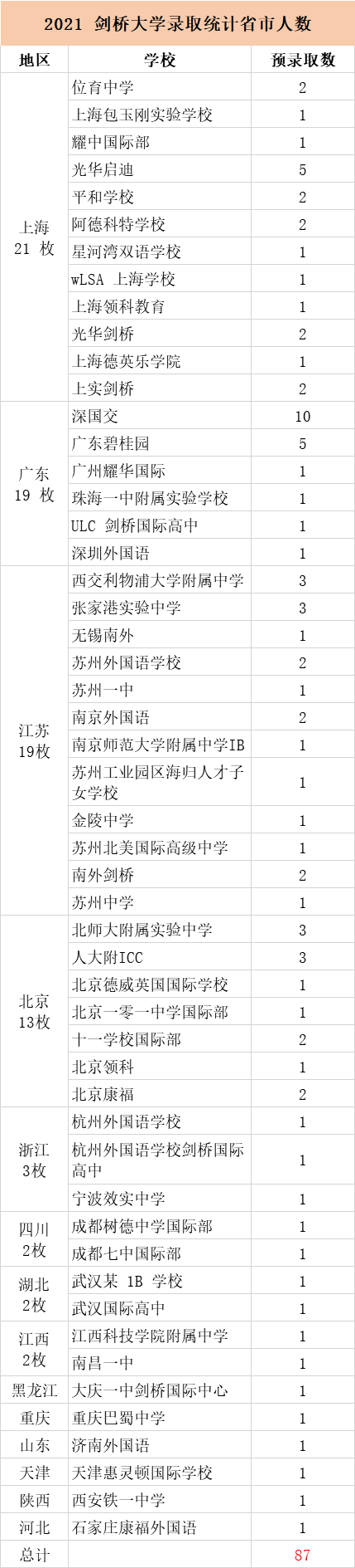 深國交一馬當先,拿下10份預錄取offer,截止到目前,劍橋在大陸地區發榜數共計87份。(數據持續更新中,我們會在留言區更新)