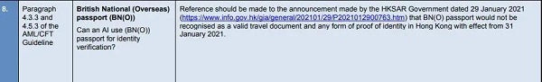 據香港《頭條日報》4日報道,香港銀行公會跟隨政府決定發出新指引,表示公會不接受銀行客戶以英國國民(海外)(BNO)護照,作為用于開立賬戶的有效旅行證件及身份證明文件。