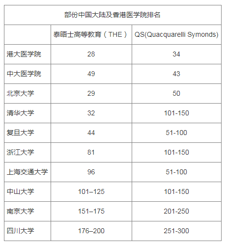 以及QS(Quacquarelli Symonds)去年世界大學(xué)醫(yī)學(xué)院排名,100名以內(nèi)共有5間中國大學(xué)的醫(yī)學(xué)院。