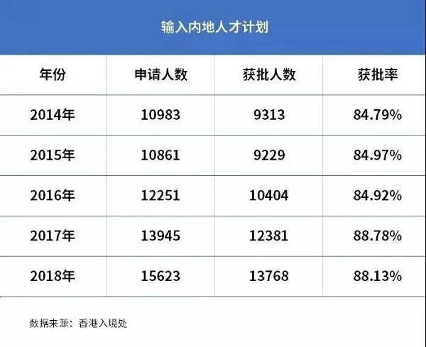 而香港專才計劃也在去年第三季度中,共批出2612宗申請個案。在2014至2018年,每年都有上萬宗申請,并且獲批率都在80%以上。