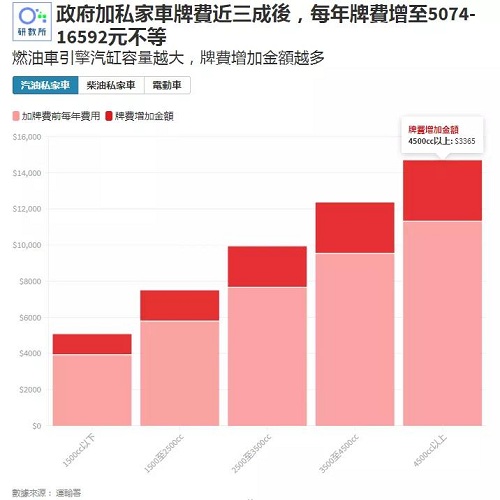 而燃油私家車4個月牌費現(xiàn)時增至1804至5836元不等,同樣是燃油車引擎汽缸容量越大,牌費增加金額越多。