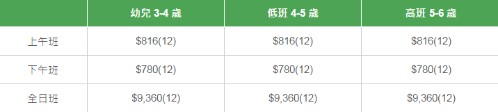 學校有參加「幼稚園教育計劃」,以下列出扣減政府資助后不同班別的全年學費和期數。