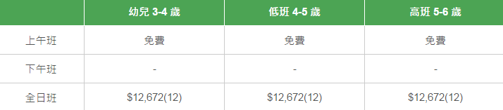 學校有參加「幼稚園教育計劃」,以下列出扣減政府資助后不同班別的全年學費和期數。